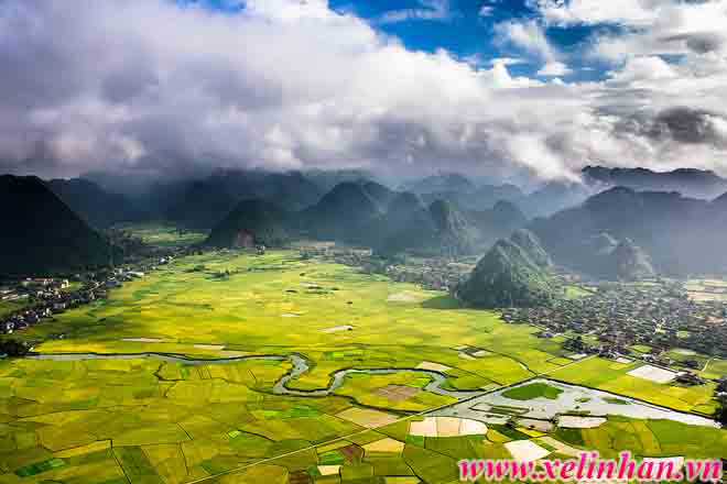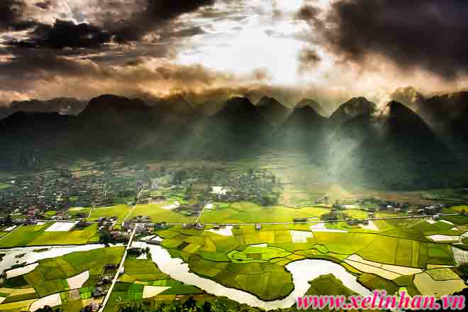 Cảnh tượng nắng lên rực rỡ sau màn mưa. Những cơn mưa mùa hạ khiến cho toàn bộ cánh đồng trong thung lũng và chân những ngọn đá vôi phủ đầy nước.